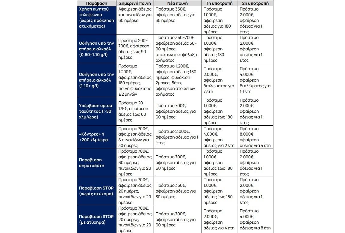 Ενδεικτικό παράδειγμά αυτής της νέας δομής ποινών αποτελεί η αντιμετώπιση της χρήσης κινητού τηλεφώνου, που το 2024 ήταν η 3η αιτία πρόκλησης τροχαίων στην Ελλάδα. Σήμερα, ανεξαρτήτως της πρόκλησης ατυχήματος, η χρήση κινητού επισύρει αφαίρεση άδειας οδήγησης και πινακίδων για 60 ημέρες.