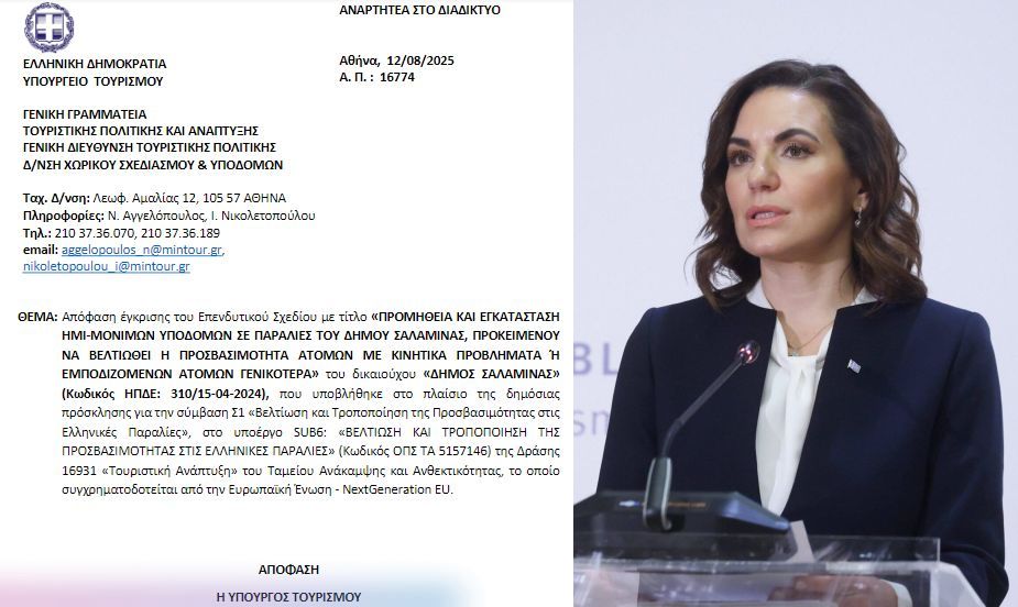 Το Υπουργείο Τουρισμού προχωρά σε μια καθοριστική πρωτοβουλία για την ενίσχυση της προσβασιμότητας στις παραλίες της Σαλαμίνας, εγκρίνοντας το επενδυτικό σχέδιο του Δήμου Σαλαμίνας για την προμήθεια και εγκατάσταση ημι-μόνιμων υποδομών. Η απόφαση αυτή εντάσσεται στο πλαίσιο της δράσης «Προσβάσιμες Παραλίες» της εθνικής στρατηγικής τουριστικής ανάπτυξης, χρηματοδοτούμενη από το Ταμείο Ανάκαμψης και Ανθεκτικότητας μέσω του NextGeneration EU, με στόχο τη δημιουργία χώρων που είναι προσβάσιμοι για όλους, ανεξαρτήτως ηλικίας ή κινητικών δυνατοτήτων.