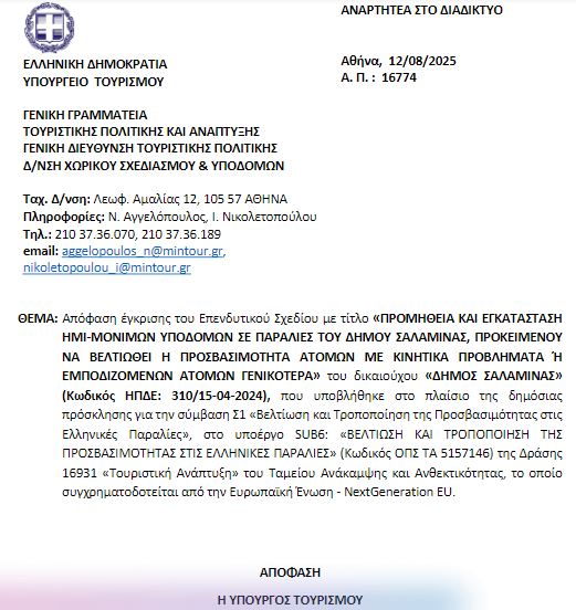 Το Υπουργείο Τουρισμού προχωρά σε μια καθοριστική πρωτοβουλία για την ενίσχυση της προσβασιμότητας στις παραλίες της Σαλαμίνας, εγκρίνοντας το επενδυτικό σχέδιο του Δήμου Σαλαμίνας για την προμήθεια και εγκατάσταση ημι-μόνιμων υποδομών. Η απόφαση αυτή εντάσσεται στο πλαίσιο της δράσης «Προσβάσιμες Παραλίες» της εθνικής στρατηγικής τουριστικής ανάπτυξης, χρηματοδοτούμενη από το Ταμείο Ανάκαμψης και Ανθεκτικότητας μέσω του NextGeneration EU, με στόχο τη δημιουργία χώρων που είναι προσβάσιμοι για όλους, ανεξαρτήτως ηλικίας ή κινητικών δυνατοτήτων.