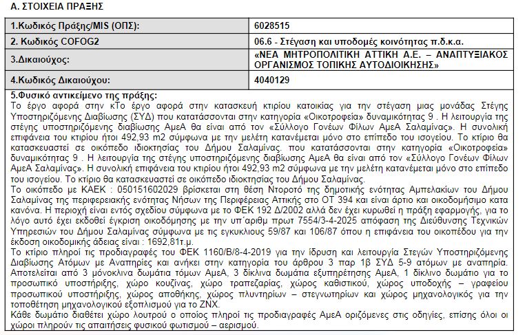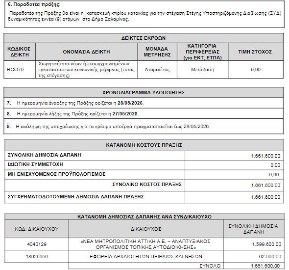 Η ένταξη της πράξης εντάσσεται στην Προτεραιότητα «Προώθηση της περιφερειακής κοινωνικής συνοχής», με στόχο την ενίσχυση των υποδομών κοινωνικής μέριμνας, της εκπαίδευσης και της υγειονομικής φροντίδας. Το έργο, λοιπόν, δεν είναι απλώς μια κατασκευή, αλλά ένα στοίχημα κοινωνικής ένταξης και υποστήριξης για την τοπική κοινωνία της Σαλαμίνας, η οποία βλέπει για πρώτη φορά ένα έργο αυτού του βεληνεκούς να παίρνει σάρκα και οστά.