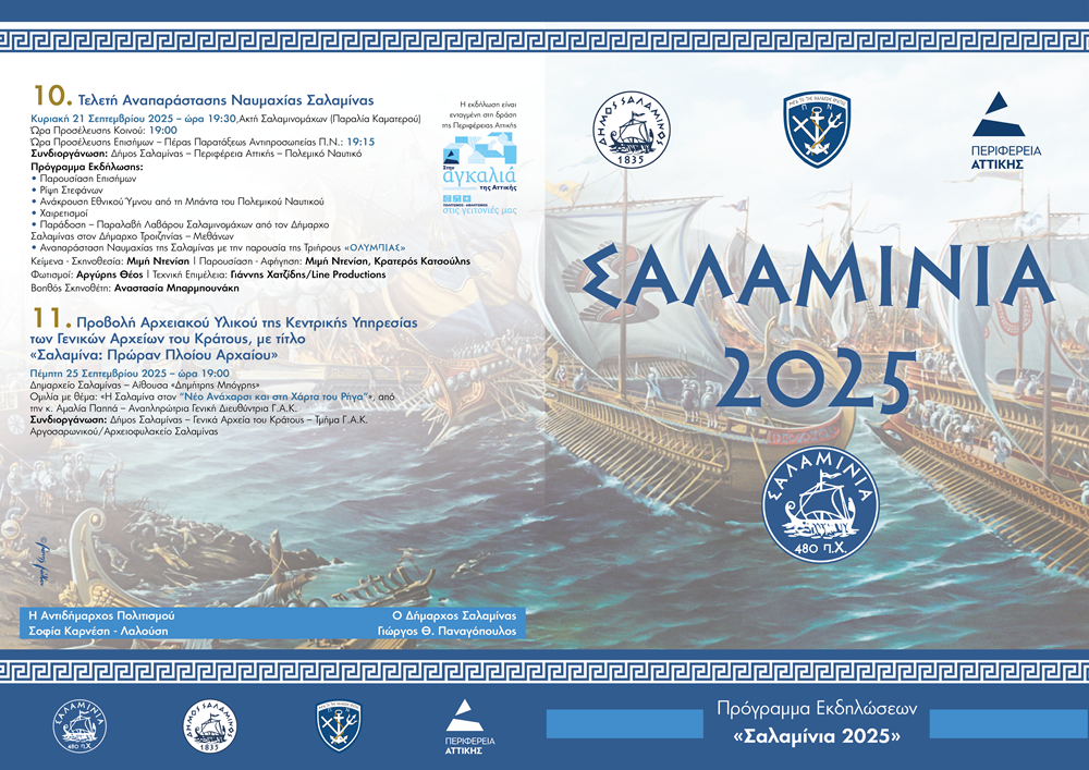 Και φέτος, ο Δήμος Σαλαμίνας διοργανώνει τα «ΣΑΛΑΜΙΝΙΑ 2025», ένα πρόγραμμα επετειακών εκδηλώσεων που τιμά τους ήρωες και αναδεικνύει τη διαχρονική αξία της θυσίας τους. Οι εκδηλώσεις περιλαμβάνουν ιστορικά δρώμενα, πολιτιστικές παρουσιάσεις και εκπαιδευτικά προγράμματα,