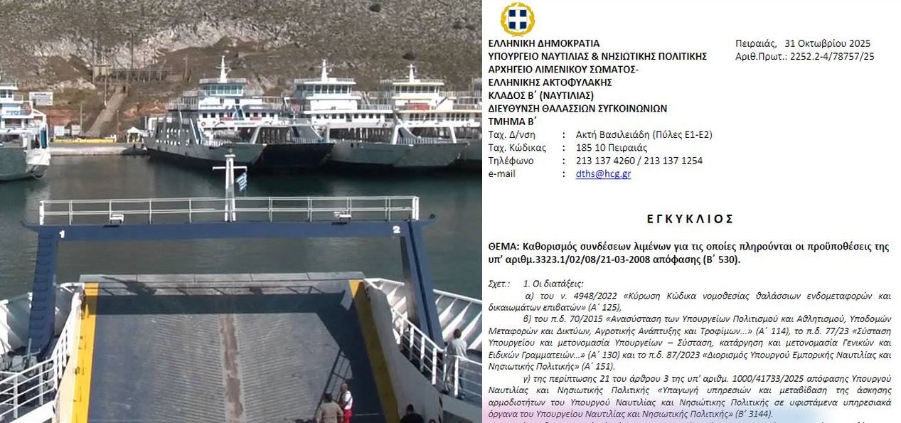 Ειδικότερα, το υπουργείο εξέδωσε στις 31 Οκτωβρίου 2025 την υπ’ αριθμ. Πρωτ.: 2252.2-4/78757/25 Εγκύκλιο, με θέμα τον «Καθορισμό συνδέσεων λιμένων για τις οποίες πληρούνται οι προϋποθέσεις της υπ’ αριθμ.3323.1/02/08/21-03-2008 απόφασης (Β ́ 530)».