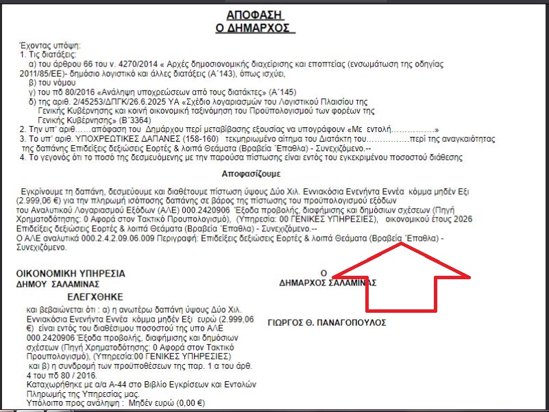 Και εάν δεν είναι το κόστος της συμμετοχής, τι αναφέρει αυτό το… έγγραφο; Τα βραβεία που δίνετε π.χ. σε εκδηλώσεις αθλητών; Τα μετάλλια; Τα βραβεία σε μαθητές; Ξεκαθαρίστε το τοπίο… Γιατί η σύμπτωση της δαπάνης με τη βράβευση στα Best City Awards είναι τουλάχιστον… αξιοσημείωτη (σ.σ. 9/2.2026 έχει ημερομηνία το έγγραφο). Η διαφάνεια δεν βλάπτει, σωστά;