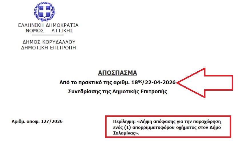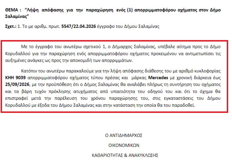 Πάμε λοιπόν στην αποκάλυψη. Στις 22 Απριλίου 2026, ο Δήμαρχος Σαλαμίνας έστειλε «γράμμα» στον Κορυδαλλό. Τι ζητούσε; Ένα απορριμματοφόρο δανεικό!