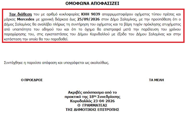 Προσέξτε και τις λεπτομέρειες. Η απόφαση του Δήμου Κορυδαλλού (Αρ. Πρωτ. 5551) είναι καταπέλτης. Παραχωρούν το όχημα, αλλά με όρους που δείχνουν πόσο «στενά» είναι τα περιθώρια: