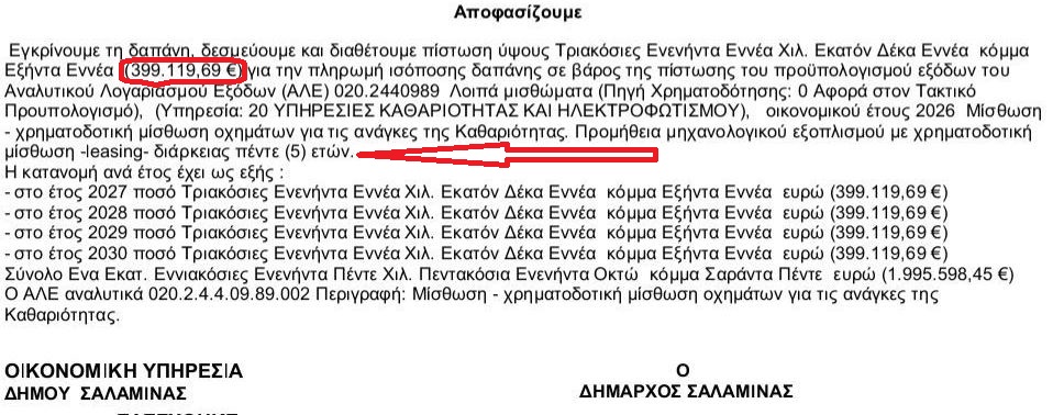 Εδώ όμως είναι που η επιστήμη σηκώνει τα χέρια ψηλά. Μόλις πριν λίγους μήνες, τον Φεβρουάριο του 2026, η δημοτική αρχή με πανηγύρια υπέγραφε δαπάνη-μαμούθ ύψους 1,99 εκατομμυρίων ευρώ για leasing οχημάτων καθαριότητας.